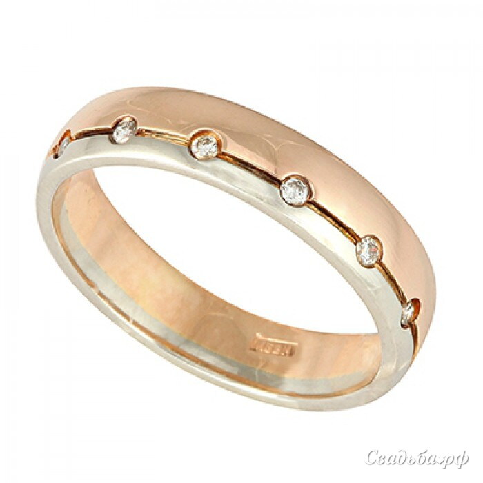 Роскошное и стильное обручальное кольцо из белого и жёлтого золота с бриллиантами. Кольцо как бы состоит из двух половинок разного цвета, символизируя единство двух противоположных начал: мужского и женского. Линия соединения украшена несколькими бриллиантами, которые источают настолько необыкновенное сияние, что любоваться ими можно хоть всю жизнь. 6бр.кр57-0.06 4/4