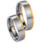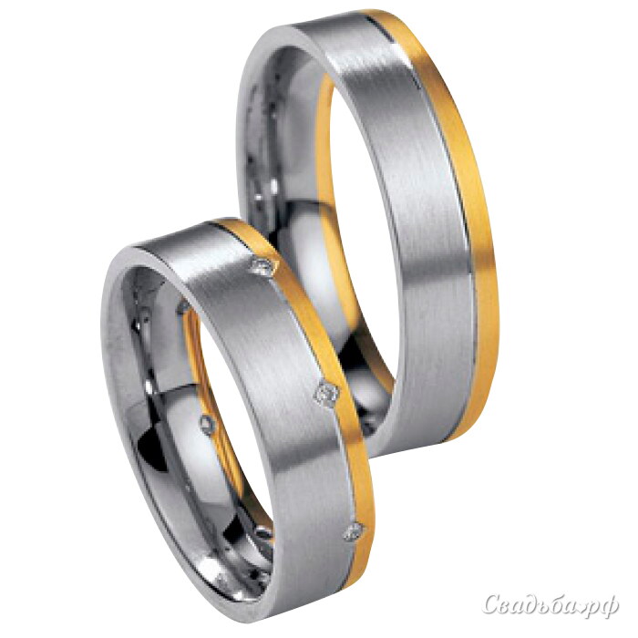 Парные обручальные кольца из комбинированного золота придутся по душе самым требовательным и стильным молодожёнам. Широкий ободок из матового белого золота дополнен тонкой полосой жёлтого драгоценного металла. Женская модель украшена несколькими чистейшими бриллиантами, расположенными на стыке двух полос. Современные кольца дополнят любой образ.