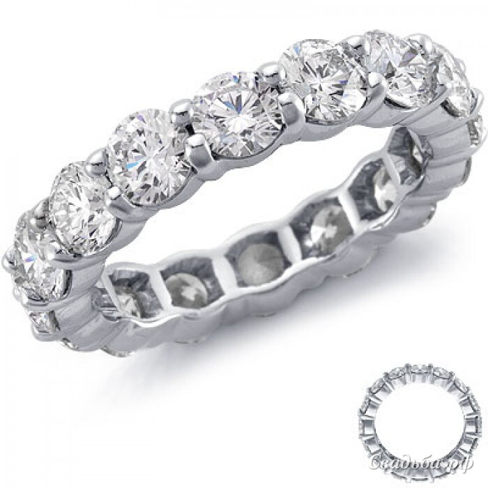 Ослепительное обручальное кольцо выполнено из белого золота высочайшей пробы. Изящный ободок усыпан крупными бриллиантами безупречной огранки. Каждый камень качественно закреплён в тонкой оправе. Такое роскошное украшение от лучших отечественных ювелиров никого не оставит равнодушным, и все взгляды окружающих будут Ваши!