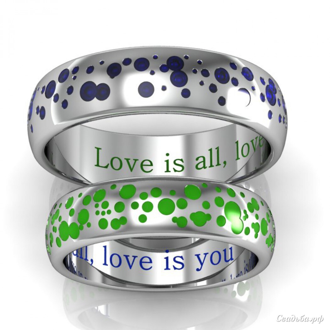 Самым оригинальным молодожёнам придутся по душе эти парные обручальные кольца из белого золота. Изящные колечки с классической формой ободка выполнены лучшими ювелирами России. Украшения дополнены цветными вставками специальной ювелирной эмали. Внутренняя сторона украшена символичной гравировкой. Кольца будут служить Вам долгие годы!