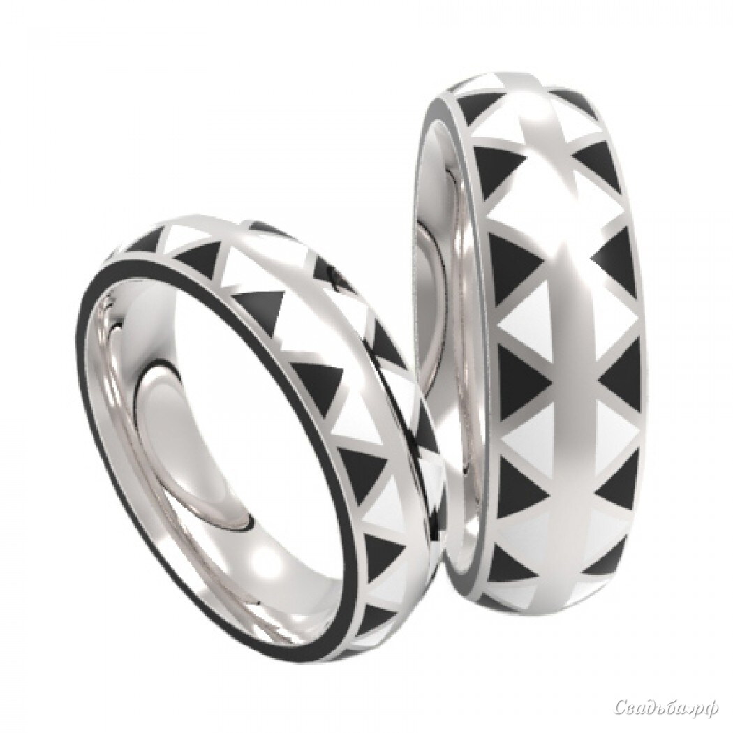 Эксклюзивные обручальные кольца из белого золота выполнены лучшими ювелирами России. Украшения дополнены оригинальным орнаментом из ювелирной эмали. Эффектное сочетание белого, серебристого и чёрного никого не оставят равнодушными. Кольца великолепно садятся на пальчик, гармонично сочетаются с другими украшениями и не царапают кожу.