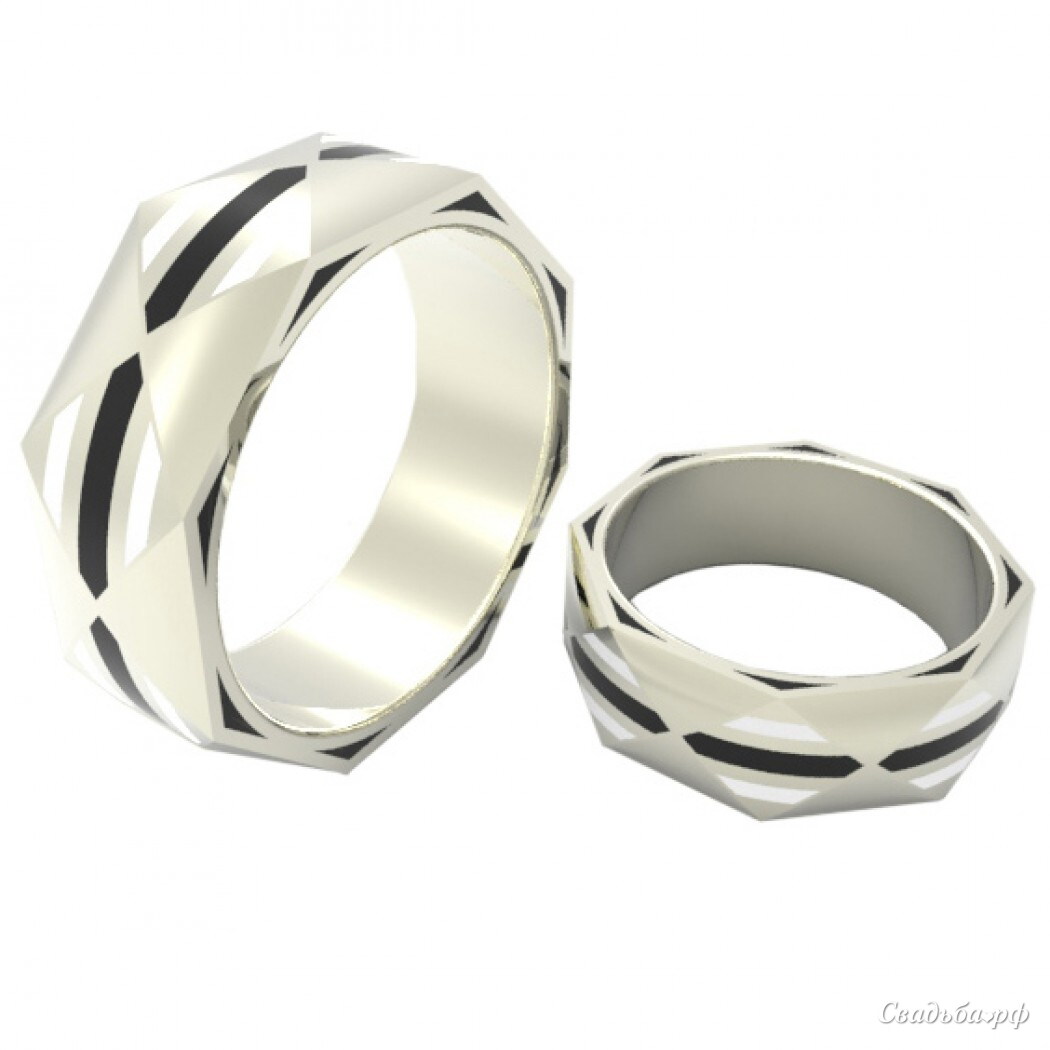 Эксклюзивные обручальные кольца из белого золота высочайшего качества дополнены оригинальным орнаментом из ювелирной эмали любых расцветок. Массивные ободки со скошенными гранями придают этим ювелирным изделиям отечественного производства неповторимый шик. Современные кольца созданы для самых стильных и требовательных молодожёнов.