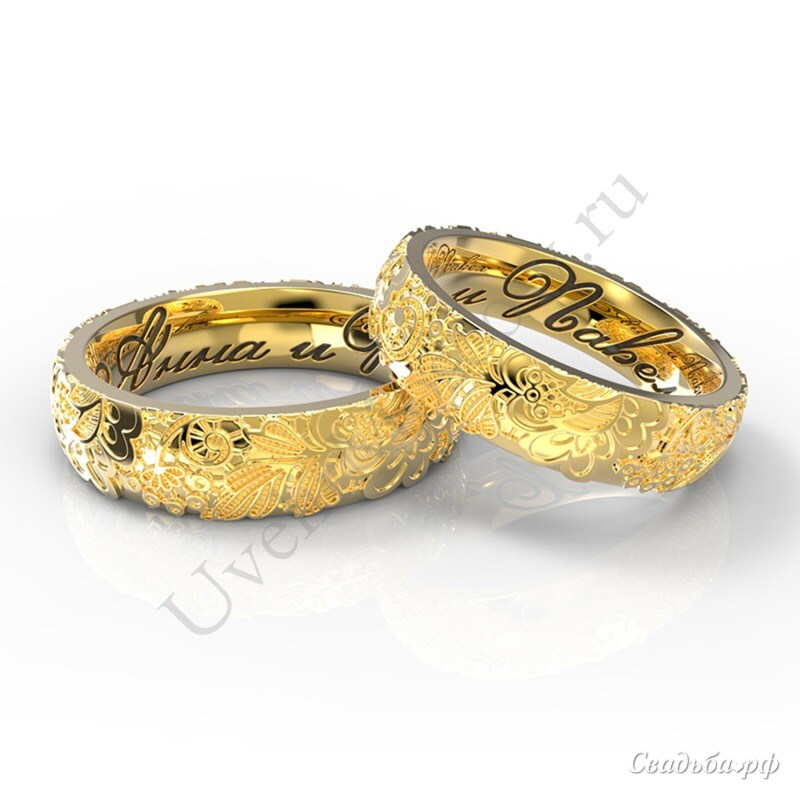 Красивые фигурные обручальные кольца. С внешней стороны ювелирные украшения декорированы объемным рисунком, который напоминает кружево, а с внутренней стороны на них может быть выгравирована именная надпись. Данная модель обручальных колец может быть изготовлена в любом цвете драгоценного металла в белом, желтом или красном золоте 585 или 750 пробы в срок от 7 дней. Указана цена за кольцо 16-го размера