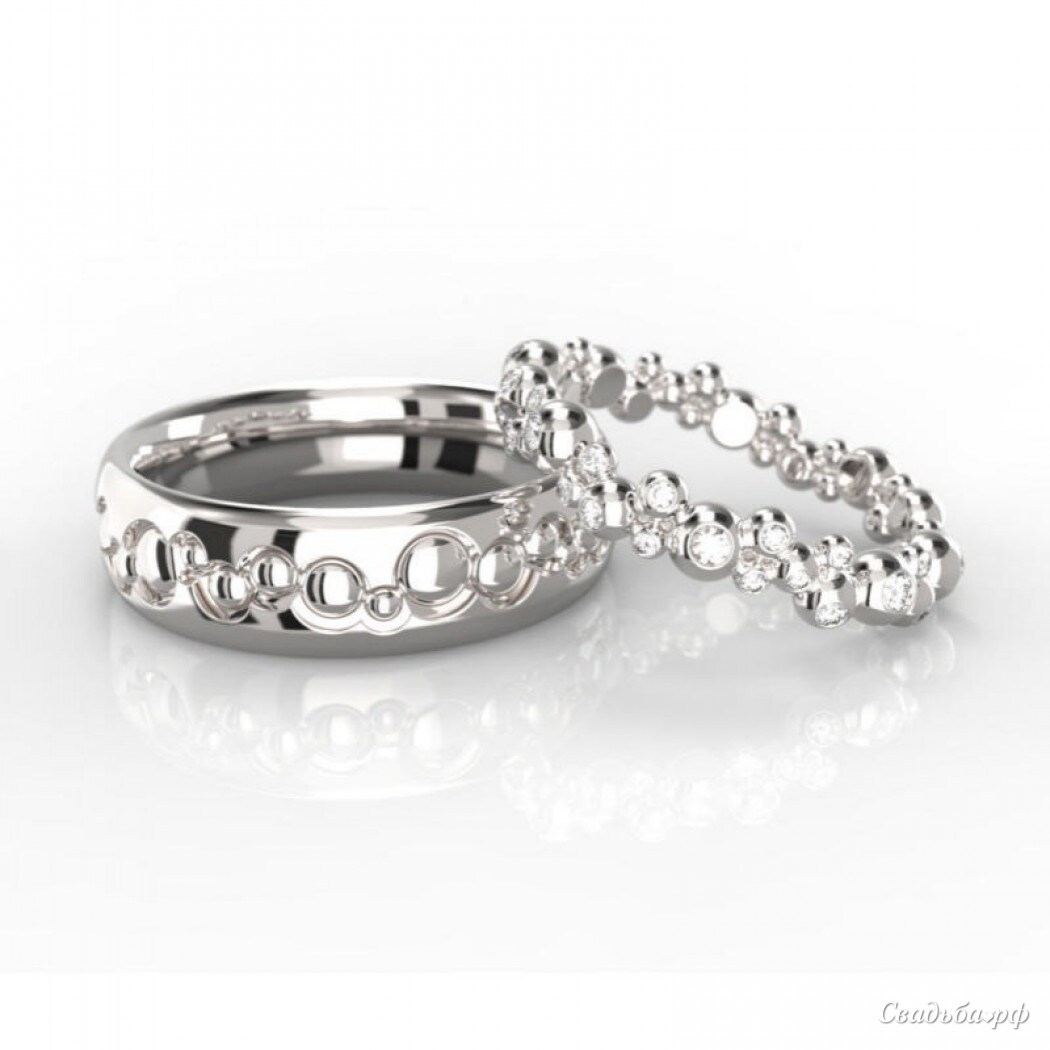 Парные обручальные кольца из платины. Мужское кольцо широкое, в центре изделия располагается рисунок, имитирующий воздушные пузырьки. Этот же прием используется и в женском изделии. Кольцо невесты фигурное и представляет собой сплетение множества пузырьков, в каждом из которых спряталось по бриллианту.