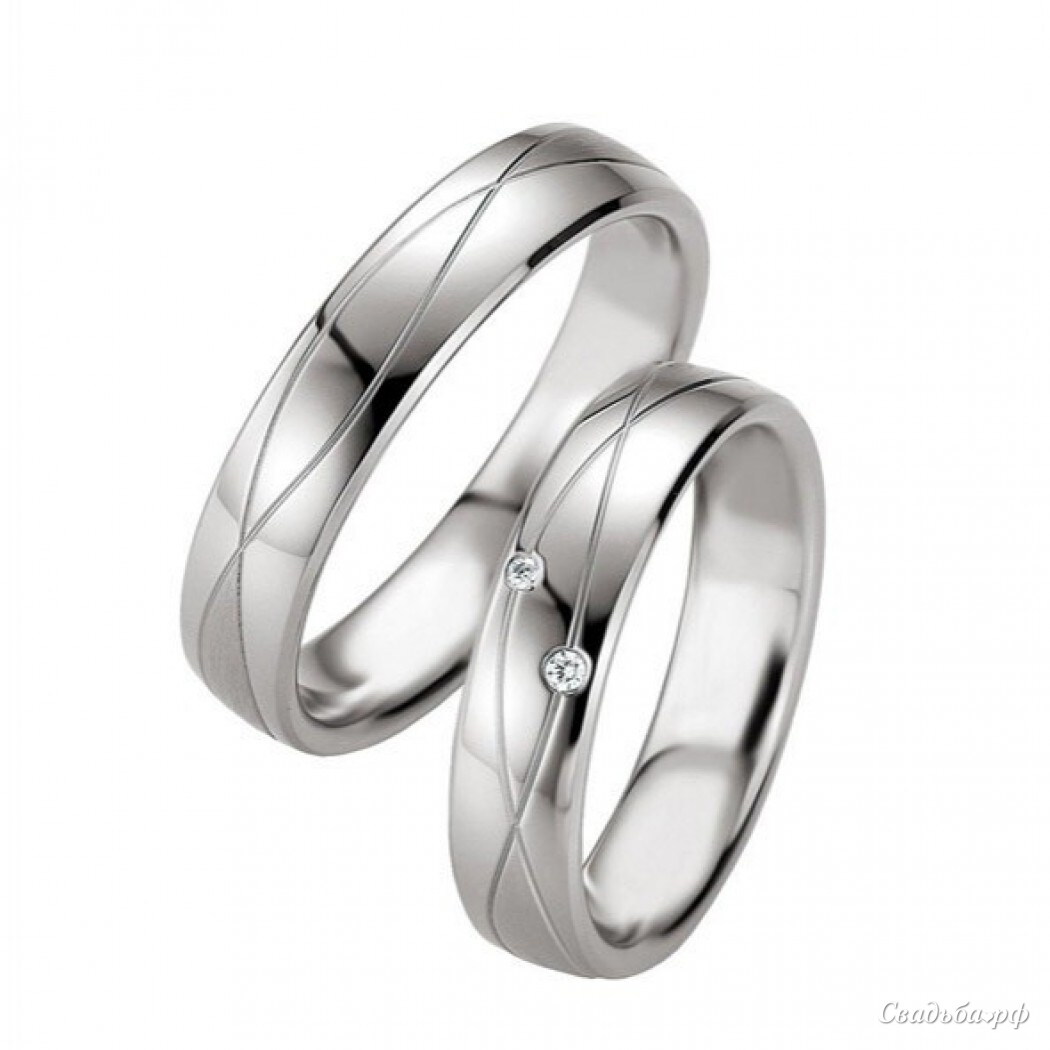 Парные обручальные кольца из белого золота. Оба кольца по своему периметру украшены плавными линиями. Женское обручальное кольцо инкрустировано двумя бриллиантами.
