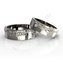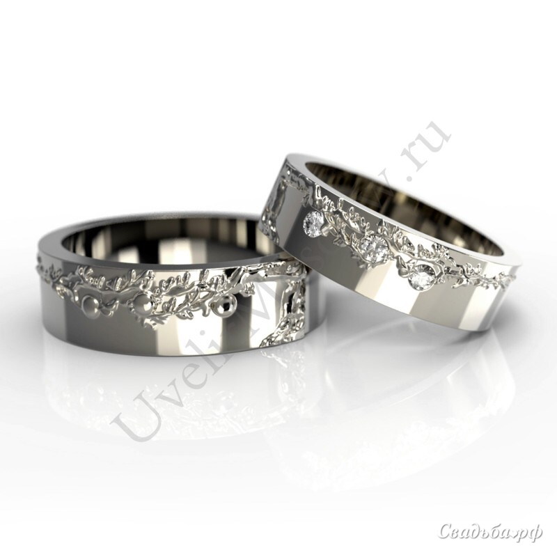 Парные обручальные кольца из белого золота. Мужской вариант кольца имеет витиеватую окантовку по верхней части ювелирного изделия. Женское кольцо украшает такой же узор, но здесь уже присутствуют вставки из бриллиантов.