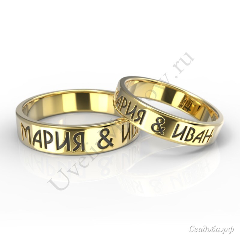 Обручальные кольца из желтого золота. Особенность данных ювелирных изделий заключается в том, что на них можно нанести гравировку с именами молодоженов с чернением. Кольца удобные и практичные в носке. Они идеально подойдут для тех молодоженов, кто хочет подчеркнуть свою индивидуальность.
