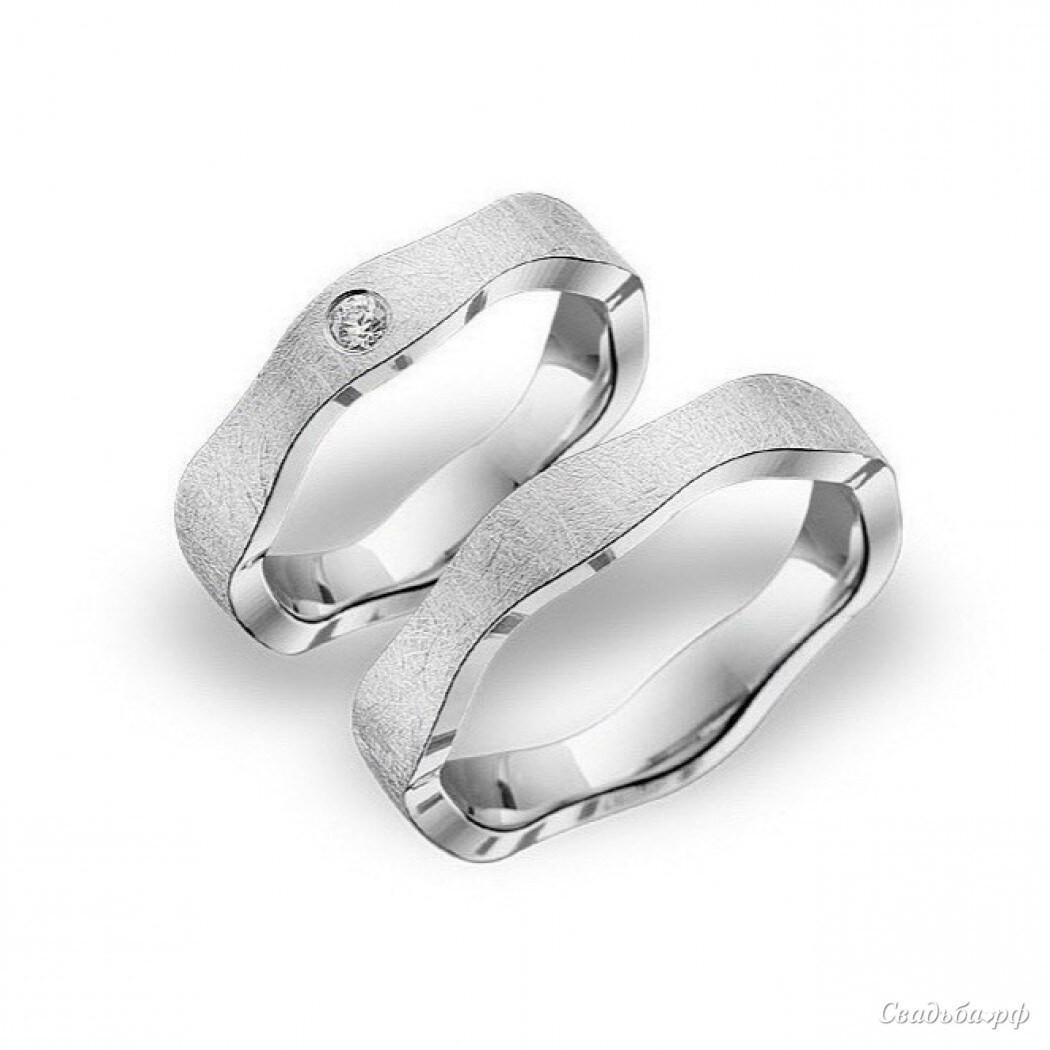 Фигурные парные обручальные кольца изготовленные из матового белого золота. Мужское кольцо изготовлено в лаконичном стиле, без декоративных элементов и вставок, а женский вариант кольца по центру украшен крупным бриллиантом.