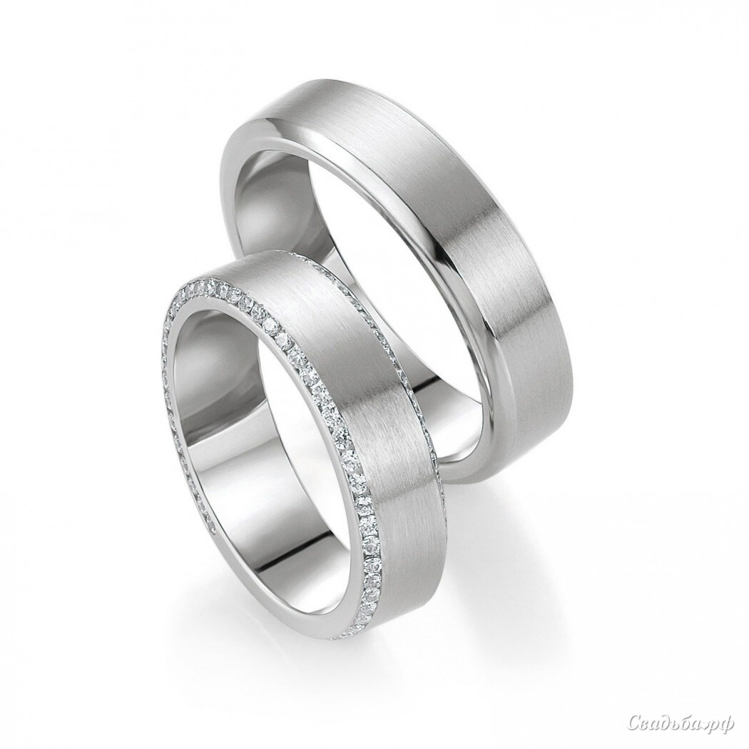 Данная модель парных обручальных колец сделана из матового белого золота. Мужское кольцо по верхнему краю украшено глянцевой полосой, а женский вариант кольца украшен дорожной из бриллиантов.