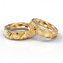 Парные обручальные кольца с фигурным орнаментом растительной тематики, поверх которого золотом нанесены имена молодоженов, причем надпись может быть сделана из золота контрастного цвета. Указана цена за изделие 16-го размера весом в 5,2 грамма.