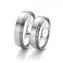 Парные матовые обручальные кольца. Ювелирные изделия выполнены из белого золота высшей пробы. В мужском варианте кольца в качестве декора используется глянцевая линия и легкое заметнее металла. А женское кольцо еще дополнено пятью бриллиантами.