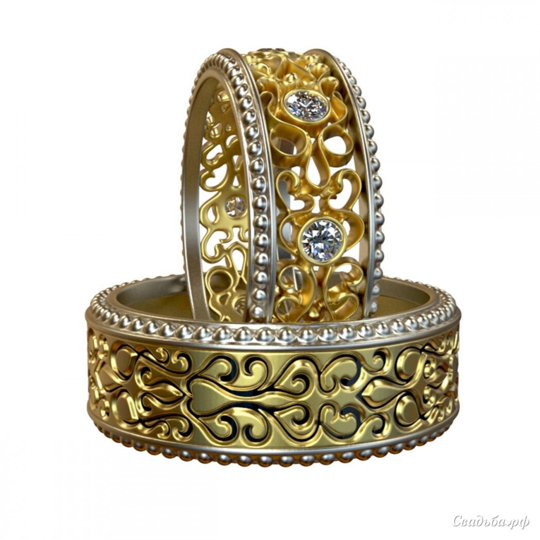 Шикарные парные обручальные кольца для истинных ценитель роскоши. Ювелирные украшения изготовлены из комбинированного золота. Мужской вариант кольца имеет множество узоров. Женское кольцо имеет рельеф и инкрустировано одним крупным бриллиантом.