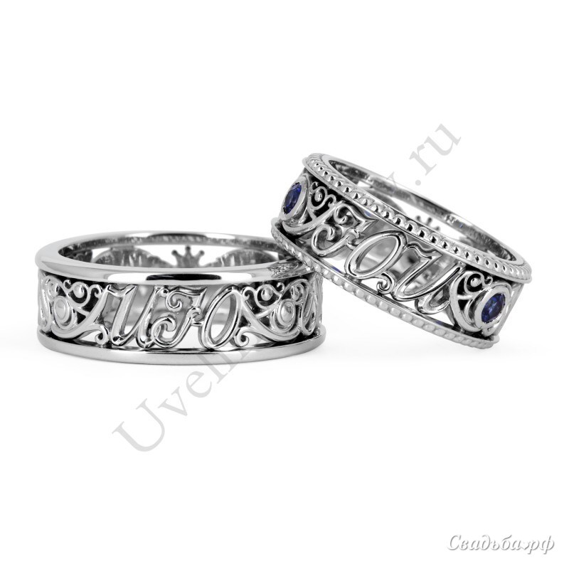 Необычные парные обручальные кольца с инициалами молодоженов, причем буквы имен не выгравированы, а сами выполнены из золота и образуют филигранный узор вместе с растительным орнаментом и четырьмя сапфирами на женском варианте. Конечно, такие украшение делаются только на заказ