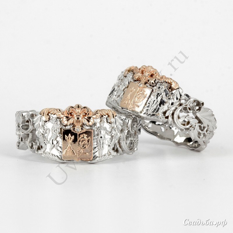 Если Вы происходите из знатного аристократического рода или хотите начать такой род и уже разработали фамильный герб, то эти парные кольца подойдут как нельзя лучше. И мужское, и женское кольцо в этой паре полностью идентичны. Само кольцо фигурное из белого золота, где лев с одной стороны и воин с другой стороны держат фамильный герб из золота контрастного цвета, который венчает небольшой бриллиант и узор в виде роскошного плюмажа