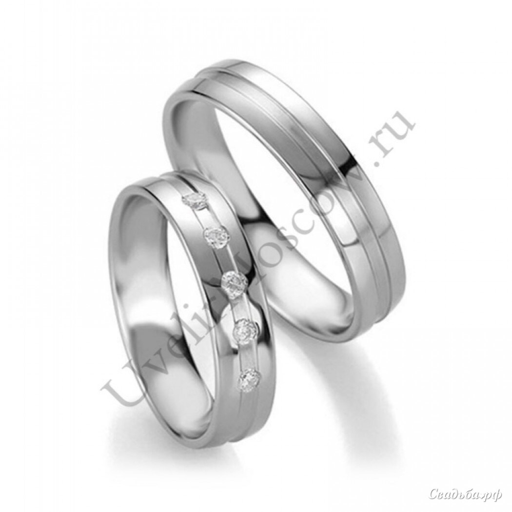 Парные обручальные кольца из белого золота. Мужской вариант кольца создан в лаконичном дизайне и не имеет никаких дополнительных вставок и декоративных элементов. А женское ювелирное украшение инкрустировано пятью бриллиантами по 0,014 ct.