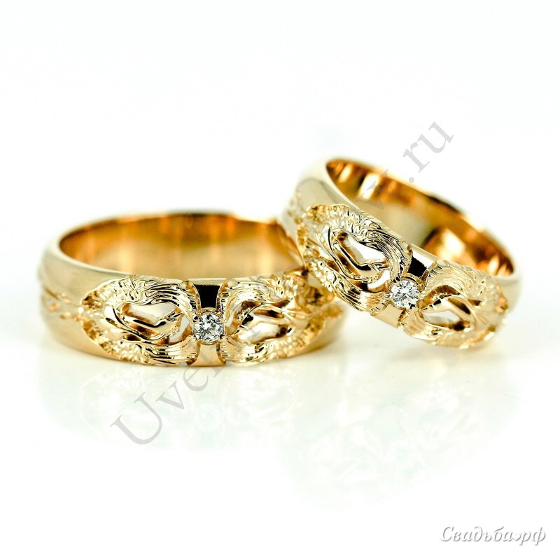 Необычные обручальные кольца из желтого золота, декорированные симметричным элементом в форме птицы Феникс. В центре колец располагается бриллиант безупречной огранки, две птицы как бы преподносят на крыльях этот бриллиант. Эти ювелирные изделия идеально подойдут как жениху, так и невесте. Наши мастера предлагают различные варианты исполнения данной модели обручальных колец. Их окончательная цена будет зависеть от металла и вида драгоценных камней. Указана цена за изделие 16-го размера.