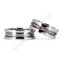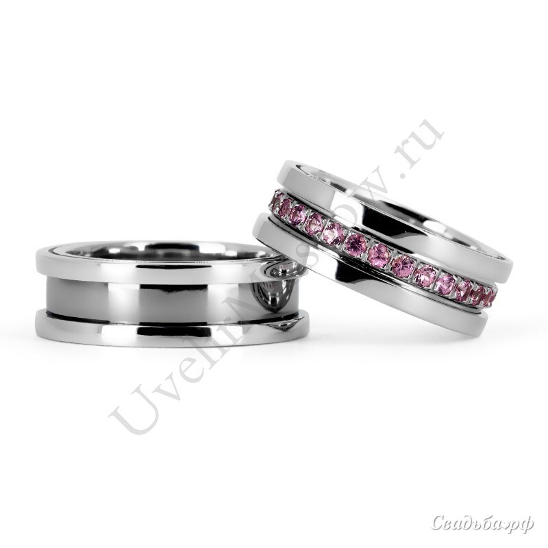 Фигурные парные обручальные кольца. Мужской вариант кольца сделан в лаконичном дизайне из белого золота и не декорирован драгоценными камнями. Женское кольцо инкрустировано 33 розовыми сапфирами и 10 бриллиантами.