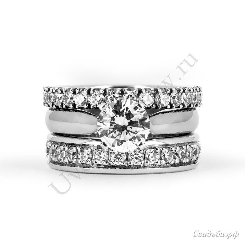Это идеальный вариант для тех пар, кто хочет создать в единой стилистике дизайн помолвочного кольца и обручального. И этот комплект станет для вас идеальным. На фото представлено 3 кольца: 2 обручальных и помолвочное кольцо между ними. Кольца выполнены из белого золота 585 пробы. Обручальные кольца по всему периметру инкрустированы россыпью мелких бриллиантов. Помолвочное кольцо в центре украшено большим красивым бриллиантом 0,66 карат