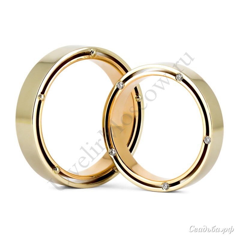 Обручальные кольца из комбинированного золота 585 пробы. По желанию молодоженов цвет золота и проба могут быть изменены на любой другой. Эти кольца удобные и практичные, они идеально подходят к любому стилю супругов. Мужское обручальное кольцо без камней и женское с бриллиантами. Оригинальность данной модели заключается в расположении бриллиантов, все они спрятаны в шинки кольца, по 5 камней с каждой стороны, в мужской модели золотые «гвоздики» заменяют бриллианты.