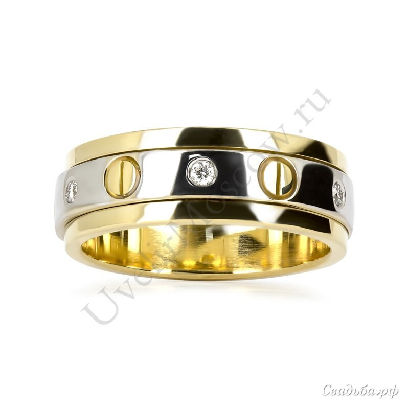Данное обручальное кольцо по праву можно назвать мужским. Украшение сделано из комбинирования белого и желтого золота 585 пробы и инкрустировано шестью бриллиантами, которые чередуются с имитацией золотых винтиков по всему периметру изделия. По желанию заказчика цвет металла и драгоценные камни могут быть изменены. Цена указана за изделие 18-го размера весом в шесть грамм
