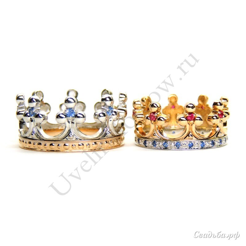 Роскошные фигурные обручальные кольца для тех молодоженов, кто хочет выделиться. Украшения сделаны в виде корон и являются полностью авторской работой. Мужское кольцо в зубцах «короны» украшают бриллианты, а женское — рубины, основание же «короны» в женском варианте инкрустировано дорожкой из бриллиантов. По желанию клиентов цвет драгоценного металла и состав камней и их вес и чистота могут быть изменены.
