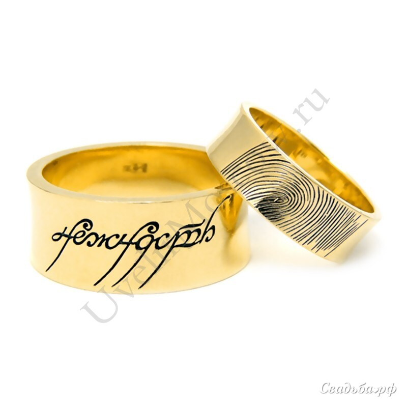 Парные обручальные кольца современного дизайна. Площадь ювелирного изделия позволяет декорировать его принтом в виде отпечатка пальца с чернением или необычной гравюры. Кольца выполнены из желтого золота высшей пробы. По желанию клиента цвет металла и его проба могут быть изменены.