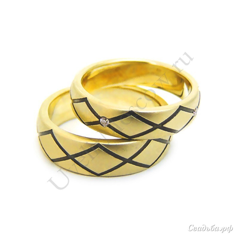 Парные обручальные кольца из матового желтого золота с узорами в виде ромбов, выполненных чернением. Женский вариант кольца инкрустирован четырьмя бриллиантами. На мужском кольце вставок нет.