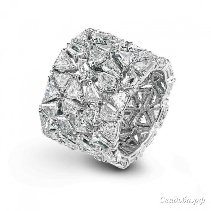 Представленное обручальное кольцо достойно особы царских кровей. Массивный ободок из белого золота усыпан чистейшими бриллиантами безупречной огранки. Каждый драгоценный камень искусно закреплён в своей собственной оправе, благодаря чему кольцо может похвастаться оригинальной фактурой. С таким колечком Вы всегда будете в центре внимания.