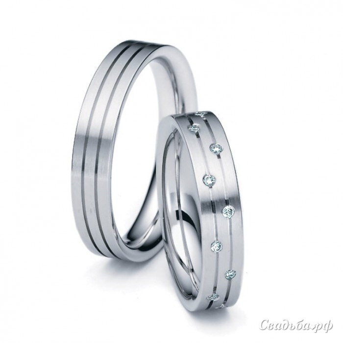Парные обручальные кольца из белого золота выполнены ведущими отечественными ювелирами. Широкие ободки с двумя продольными выемками каждый комфортно сидят на пальчике. Женская модель дополнена чистейшими бриллиантами безупречной огранки, уютно расположившимися по всему ободку. Колечки выглядят современно и неповторимо.