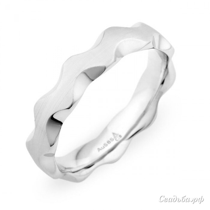Самым стильным и оригинальным молодожёнам мы рады предложить это обручальное кольцо из белого золота. Необычный ободок с матовой поверхностью и сверкающими вставками по бокам может похвастаться плавными линиями и изогнутыми краями. Такое кольцо отечественного производства станет эффектным штрихом Вашего безупречного образа.