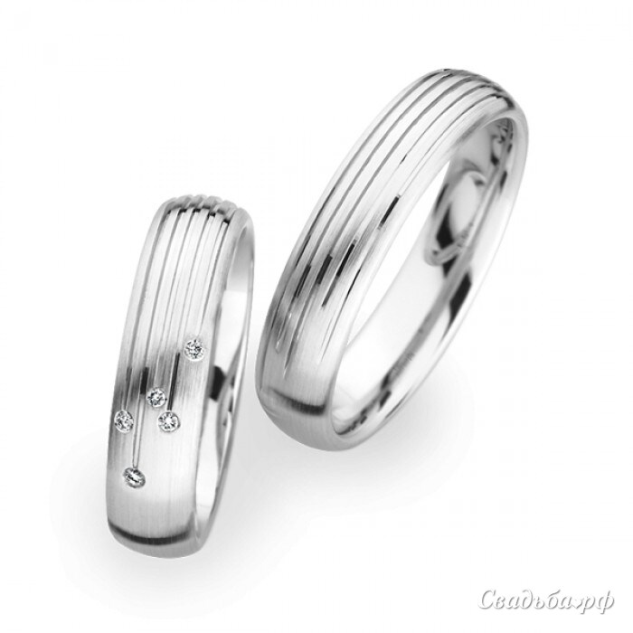 Оригинальные обручальные кольца для жениха и невесты представляют собой гармоничный союз классики и модерна. Ободки традиционной формы выполнены из белого золота высочайшего качества. Каждое кольцо дополнено тонкими продольными желобками. Каждая выемка на женском колечке заканчивается сверкающим бриллиантом безупречной огранки.
