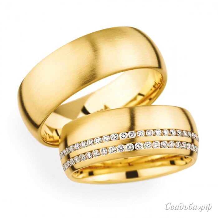 Роскошные обручальные кольца от ведущих ювелиров России выполнены из жёлтого золота высочайшего качества. Украшения представляют собой гармоничный союз классики и модерна. Широкие ободки традиционной формы удобно сидят на пальце. Женская модель дополнена двумя продольными рядами чистейших бриллиантов безупречной огранки.