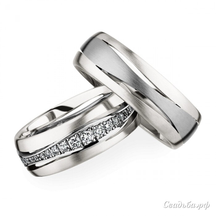Роскошные обручальные кольца для жениха и невесты выполнены из белого золота 585 пробы и платины 950 пробы. Мужское кольцо с матовой продольной вставкой отличается оригинальным дизайном и высочайшим качеством исполнения. Женская модель украшена целой дорожкой чистейших бриллиантов. Кольца не потемнеют и не потускнеют со свременем.
