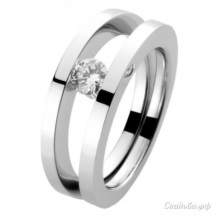 Оригинальное обручальное кольцо из белого золота придётся по душе самым стильным и требовательным молодожёнам. Колечко расходится на два отдельных ободка, между которыми зафиксирован крупный бриллиант безупречной огранки. Ещё один драгоценный камень расположился в боковой грани – пусть это будет Вашим маленьким секретом!