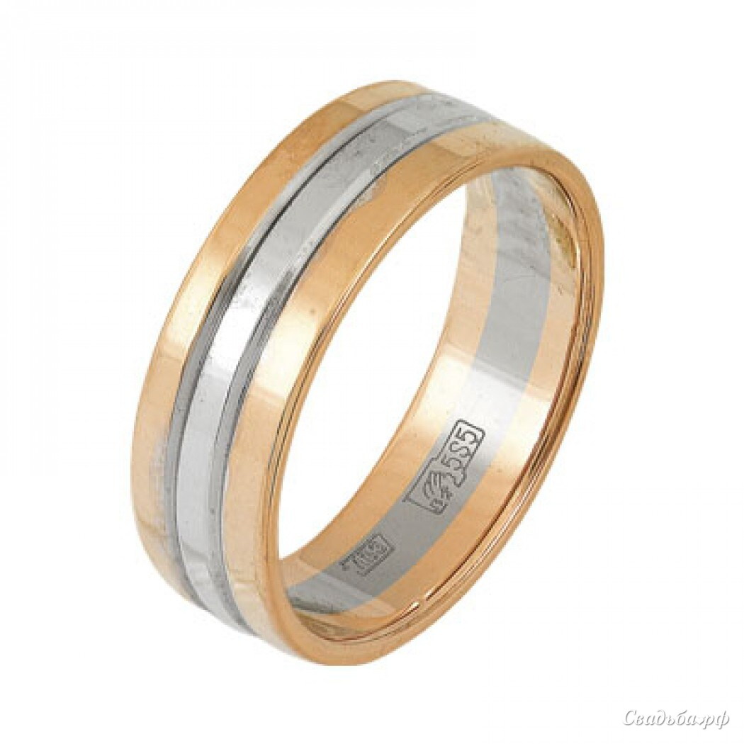 Комбинированное обручальное кольцо выполнено лучшими отечественными ювелирами из жёлтого и белого золота. Серебристая продольная вставка в середине гармонично сочетается с золотистыми краешками. Колечко не перегружено лишним декором, что оценят любители классических форм и элегантного стиля. Красивый символ Вашей вечной любви.