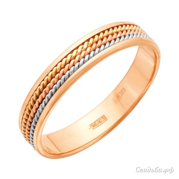 Не можете определиться с драгоценным металлом для своего обручального кольца? Зачем выбирать, если можно совместить их все сразу в одном изделии? Представленное колечко с изящным ободком дополнено тремя переплетёнными вставками из жёлтого, красного и белого золота. Такая модель от лучших отечественных ювелиров смотрится оригинально и стильно.