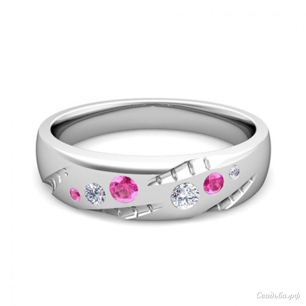 Обручальное кольцо из белого золота с бриллиантами и розовыми сапфирами.