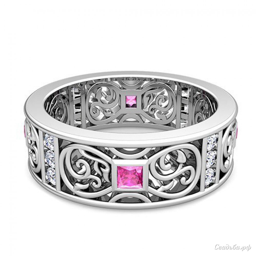 Оригинальное обручальное кольцо в кельтском стиле из белого золота с бриллиантами и розовыми сапфирами.