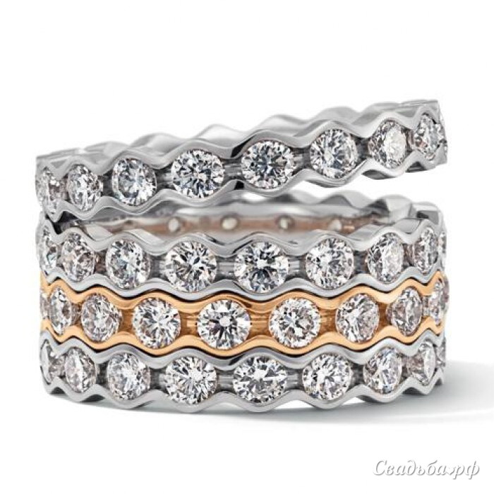 Невероятное кольцо, состоящее якобы из четырех колец из разных видов золота. Украшено бриллиантами и имеет волнистую форму. Такая модель идеально подойдет тем, кто ищет только самое лучшее. Внутренняя поверхность с выемками позволяет кольцу комфортно сидеть на пальце. Цена будет зависеть от варианта исполнения.