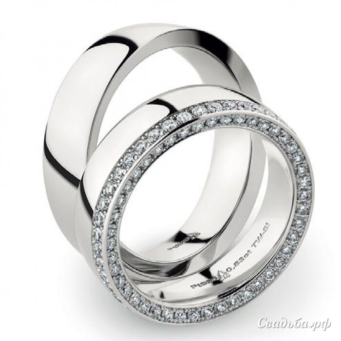 Парные обручальные кольца традиционного дизайна из белого сверкающего золота. Женский вариант кольца дополнен двумя бриллиантовыми радужками по всей окружности. Внутренняя часть слегка выпуклая и обеспечивает комфортное ношение изделий. Кольца представляют собой торжество настоящего мастерства и качества.