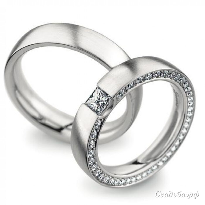 Восхитительные обручальные кольца из белого золота. Женский вариант ювелирного изделия украшен бриллиантом квадратной формы в центре и более мелкими камнями на боковой части поверхности кольца. Внутренняя часть слегка выпуклая и обеспечивает комфортное ношение изделий. Эти кольца предназначены для стильных и активных людей, любящих сочетать удобство и красоту.