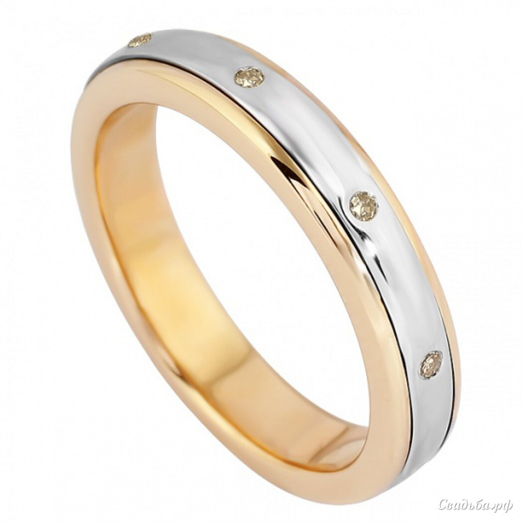 Современный дизайн и эффектное сочетание сразу двух драгоценных металлов 585 пробы – именно это отличается представленное обручальное кольцо отечественного производства. Основа из красного золота и продольная вставка из белого гармонично сочетаются друг с другом. Ободок украшен несколькими чистейшими бриллиантами безупречной огранки.