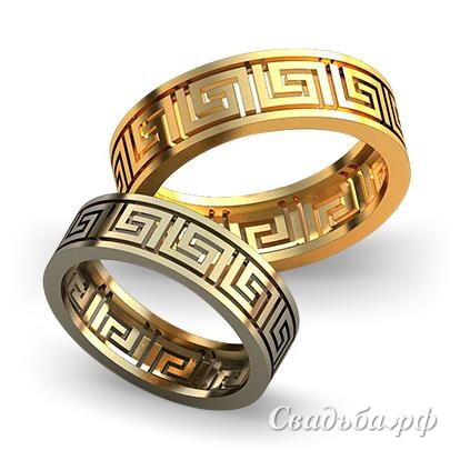 Обручальные кольца из 585 пробы с выпиленным орнаментом "меандр". Так называемая меандровая лента, названная так в честь извилистой реки Меандр, в древности символизировала человеческую жизнь и вечность и вот уже много веков является одним из самых популярных орнаментов.