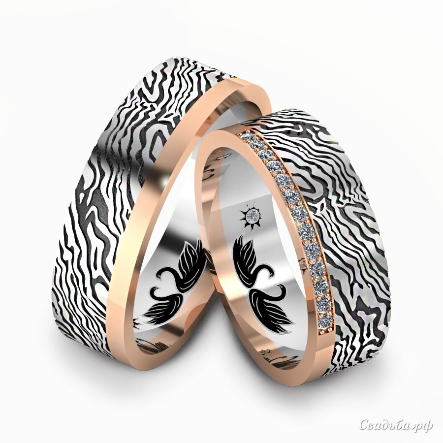 Парные обручальные кольца с очень необычным дизайном. Оба украшения сделаны из комбинированного золота орнаментом, где используется техника чернения. Мужское кольцо в верхней части имеет окантовку из красного золота. У женского кольца окантовка инкрустирована дорожкой из бриллиантов. Оба украшения со внутренней стороны имеют по одному бриллианту.
