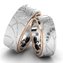 Красивые массивные обручальные кольца из золота комбинированного цвета. По верхнему контуру украшения проходит полоса контрастного желтого цвета. Украшения выполнены с эффектом матирования, на них нанесен фактурный рисунок. Мужское кольцо со внутренней стороны инкрустировано одним бриллиантом. Женское со внешней стороны украшено дорожной из бриллиантов и одним с внутренней стороны изделия.
