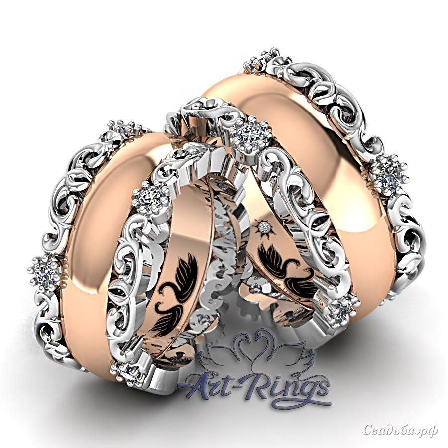 Фигурные обручальные кольца из комбинированного золота. Украшения имеют очень необычный дизайн и кажется, что они ажурные. Этот эффект достигается благодаря контрастному фигурному рельефу в верхней и нижней части украшения. Бриллианты украшают эти кольца только со внутренней стороны.