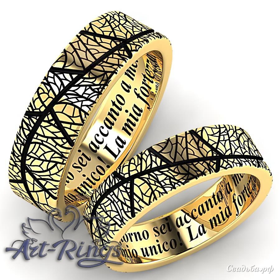 Обручальные кольца из желтого золота с очень необычным дизайном. По всему периметру украшения декорированы витиеватым дизайном, который выполнен техникой чернения. Данные ювелирные изделия смотрятся очень эффектно.