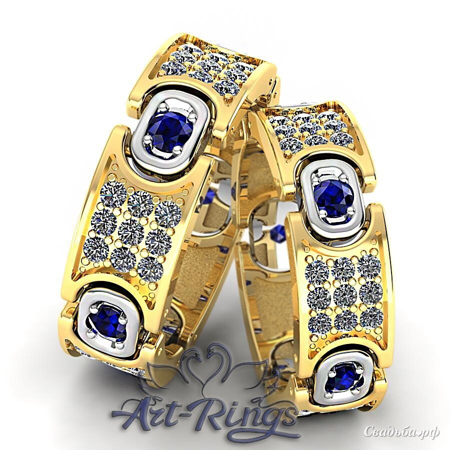 Потрясающие по своей красоте обручальные кольца из комбинированного золота желтого и белого цветов. Кольца инкрустированы шестью сапфирами и 45 бриллиантами небольшого размера. Такие обручальные кольца никогда не выйдут из моды.