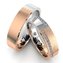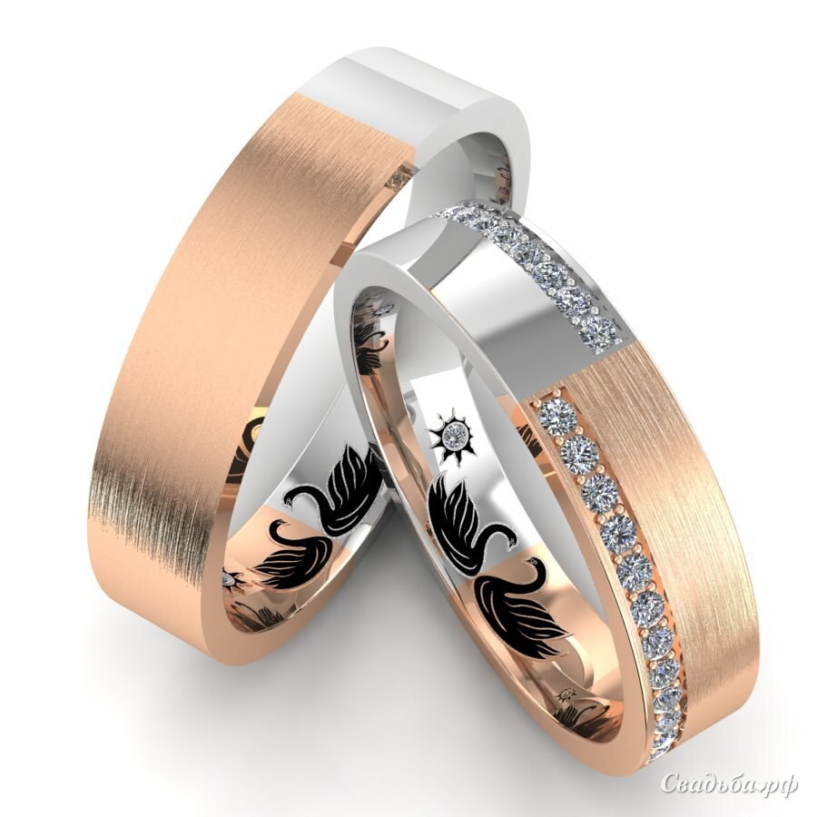 Оригинальные парные обручальные кольца из комбинированного золота. Мужское украшение инкрустировано одним небольшим бриллиантов со внутренней стороны. У женского варианта кольца на внешней стороне имеются две дорожки из бриллиантов. Оба украшения визуально поделено на две ровные части, каждая из которых имеет свой цвет золота: красный и белый.Стоимость указана в размерах 16 и 18. напишите ваши размеры и мы отправим вам цену.