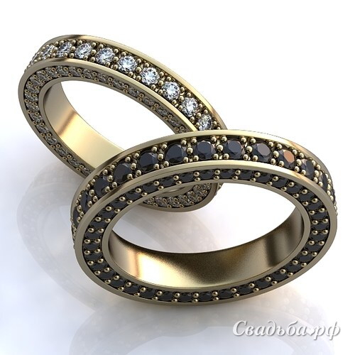 Парные обручальные кольца из белого золота. Оба украшения выполнены в едином дизайне, а отличаются только камнями. Одно кольцо полностью инкрустировано бриллиантами черного цвета, второе украшение - белыми, причем инкрустация и с внешней стороны, и с боковой.